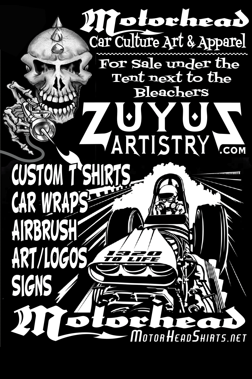 SPONSORS BLP XTREME PERFORMANCEBLP designs and manufactures high-quality performance racing fuel systems, drive components, and engine accessory parts. PINTOS AUTO REPAIRWith a goal for long lasting relationships with all Pinto's customers, we strive to gain your trust. We work with extended warranties to help ensure that your needs are met. BIG PITT CONSTRUCTIONResidental, commercial, additions and remodels. ZUYUS ARTISTRYZuyus Artistry is a full service graphic design company located in Orange City and serving all of Central Florida. ORLANDO SPEED WORLD DRAGWAYOrlando's leading drag way. VP RACING FUELSFor 50 years VP Racing has been crafting and producing the best race fuels in the world. REAL STREET PERFORMANCEReal Street Performance is the parts supplier that racers and retailers all over the world SOUTHERN EXHIBITS, INCMulti-line distributor of portable and modular trade show displays AAA TROPHIESSpecialize in delivering awards, promotional products and custom apparel on demand HAGERTY CLASSIC CAR INSURANCEKeep classic cars on the road. Get a real-time car insurance quote based on your zip code. SPEED AND KULTUREImmortalizing Americana. One story at a time. GASSER MADNESSLearn about the fabled Gas Classes of the 60’s